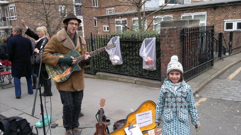 На снимката – Роби на Портобело Маркет с малка фенка!