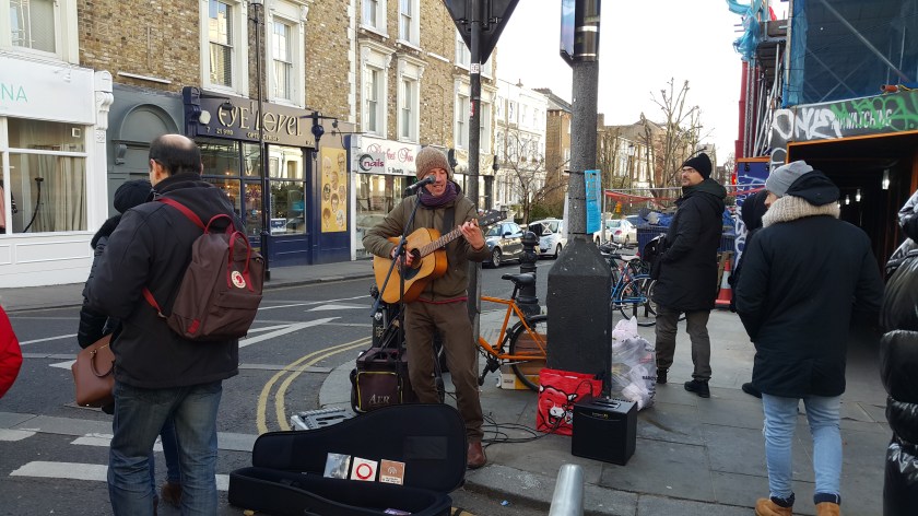 Рубриката Portobello Live today може би ще ви се види малко постна. Причината е, че днес на Портобело имаше само един музикант. Когато температурата на въздуха е -1 градус е по-вероятно даже да няма нито едни музикант, или ако има – очаква се той да е някой англичанин, свикнал с тукашните температури.