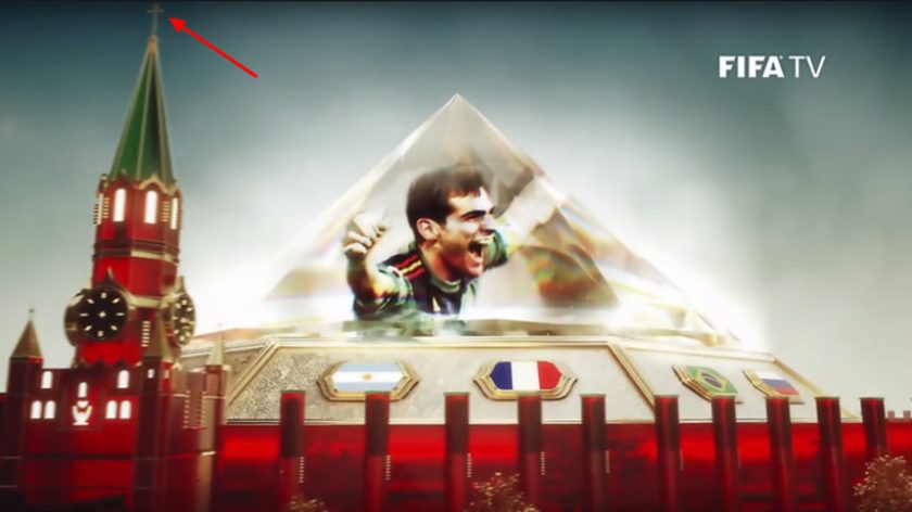 Умниците от FIFA сътвориха голяма глупост. В официалната заставка на Световното първенство по футбол, което започва в Русия след няколко дни, на върха на най-известната кулав Кремъл – Спасская Башня има кръст, а не петолъчка.