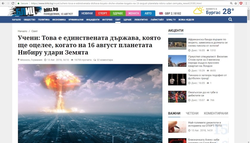 Заглавието съвсем ясно казва, че на 16 август планетата Нибуру ще удари Земята и ако кликнете да прочетете по-надолу, ще разберете коя е единствената държава, която ще оцелее. Хващате се за главата и кликвате, надявайки се това да е България. ЯДЕЦ. Ядец, не защото не е България, а защото вътре в “материала” пише: ако Земята бъде ударена от планетата Нибуру.