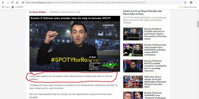Вчера Daily Star сътвориха чутовна глупост, като написаха, че Рони О’Съливан има седем световни титли по снукър. Само в едно изречение: “The snooker legend won his seventh world championship by beating Mark Allen in York last weekend” те са пуснали четири неверни твърдения.