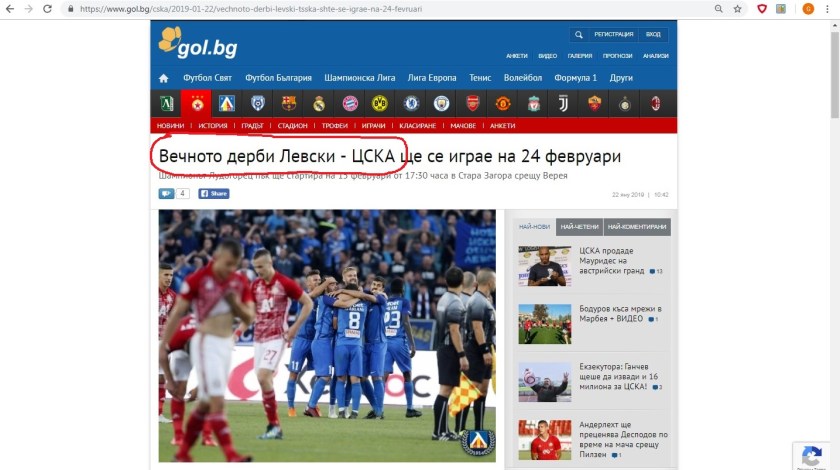 Гледам сайта http://www.gol.bg гордо обявил, че на 24 фeвруари ще се играе вечното дерби Левски- ЦСКА!