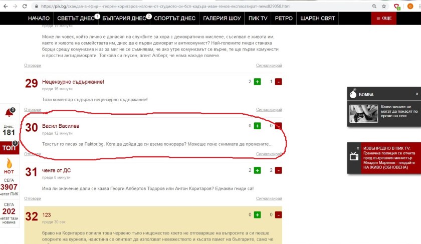В петия скрийншот, този над заглавието, ще видите коментар на Васил Василев под текста във http://www.pik.bg. Човекът пише: “Текстът го писах за Faktor.bg. Кога да дойда да си взема хонорара? Можеше поне снимката да промените…”.