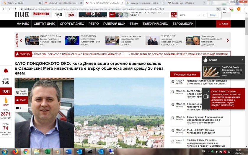 Коко Динев (който и да е той, извинете неосведомеността ми) щял да вдига виенско колело като London Eye в Сандански! Така поне пишат от www.pik.bg, вижте заглавието в скрийншота! Тия хора съвсем са го закъсали за посещения на сайта си, щом подвеждат по този елементарен начин читателите. Ако се излъжете и кликнете (отчетен пред рекламодателите,защото това е целта), ще разберете, че единственото общо нещо между London Eye и виенското колело в Сандански е, че кабинките ще са с климатик.