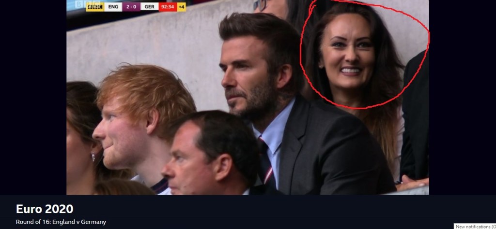 Ако сте гледали снощи мача Англия – Германия, сигурно сте забелязали кой седеше зад Дейвид Бекъм и Ед Шийрън. Камерата на два пъти показа бившия вратар на националния отбор по футбол на Англия Дейвид Сиймън и третата му съпруга – Франки Поултни, която е професионална състезателка по фигурно пързаляне. Франки e изключително популярна и от участията си в английското издание на “Dancing On Ice”.