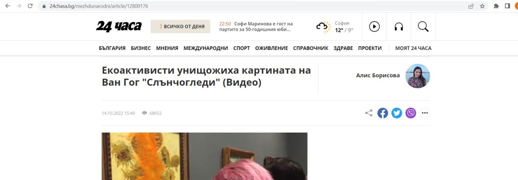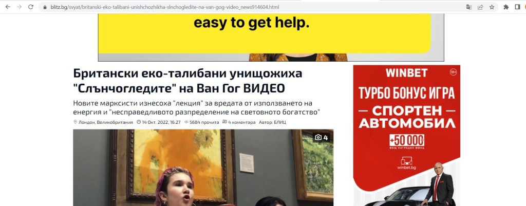Писачите в тези сайтове са абсолютни лъжци – вижте скрийншотовете: “Британски еко-талибани унищожиха”Слънчогледите” на Ван Гог” и “Екоактивисти унищожиха картината на Ван Гог “Слънчогледи”.