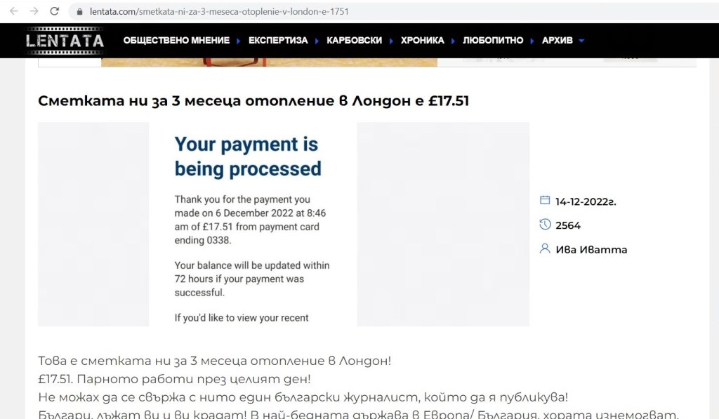 Вчера прочетох в www.lentata.com едно откровение и видях снимка на едно плащане. Плащането бе за под 18 паунда, а откровението, че това е сметката за газ в Лондон за 3 месеца, и то “без да изключваме парното”!