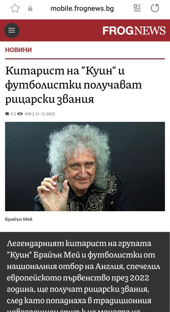 Днес http://www.frognews.bg тържествено обяви: “Китарист на “Кyин” и футболистки получават рицарски звания”.