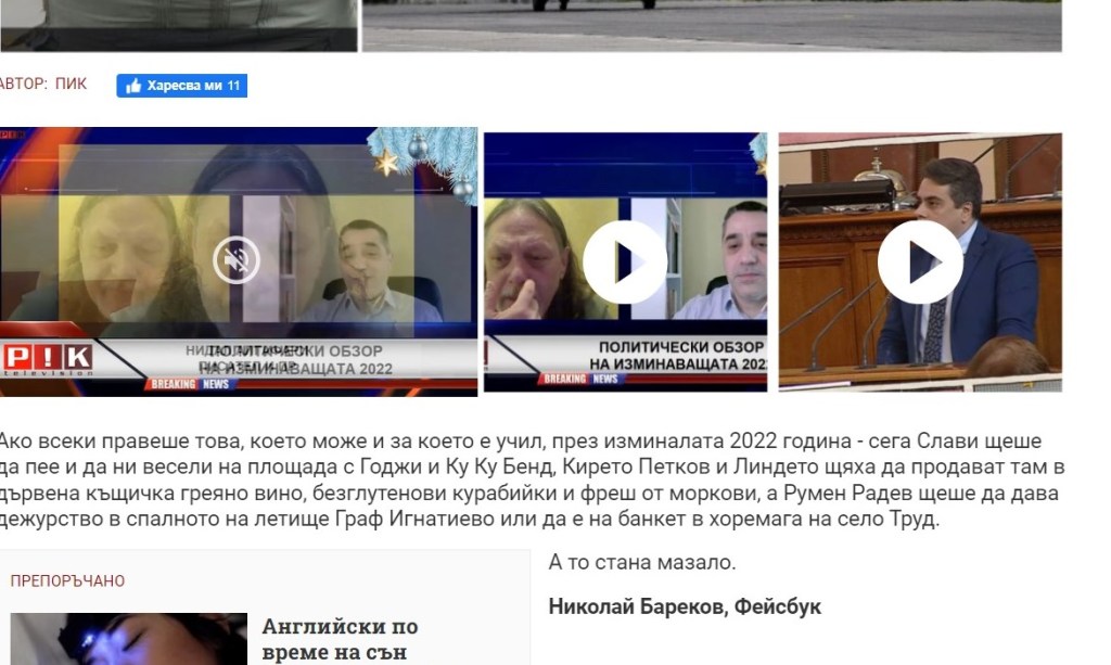 Цитат на Николай Бареков от http://www.pik.bg: “Ако всеки правеше това, което може и за което е учил, през изминалата 2022 г. – сега Слави щеше да пее и да ни весели на площада с Годжи и Ку Ку Бенд, Кирето и Линдето щяха да продават там в дървена къщичка греяно вино, безглутенови курабийки и фреш от моркови, а Румен Радев щеше да дава дежурство в спалното на летище Граф Игнатиево или да е на банкет в хоремага на село Труд. А то стана мазало”.