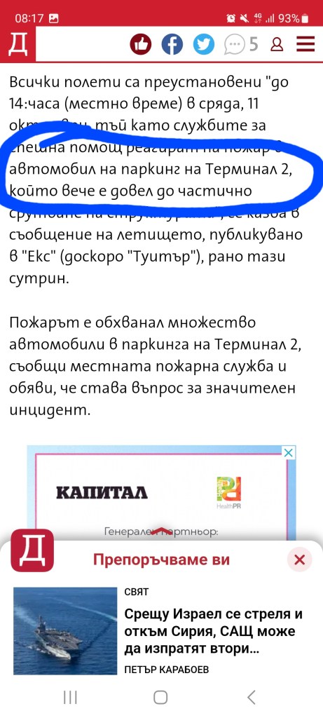 Тази сутрин www.dnevnik.bg пуснаха поредната си простотия. Цитат: “…тъй като службите за спешна помощ реагират на пожар в автомобил на паркинг на Терминал 2”.За сведение на умниците от