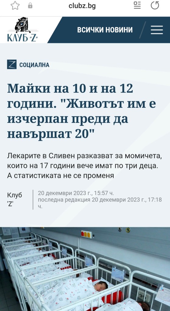 „Статистиката на НСИ и МЗ за миналата година: в Сливен има 104 деца, родени от малолетни майки. Има майка на 10 години, 4 майки на 13 години, 28 майки на 14-годишна възраст и 72 майки на по 15 години. Предполагам, че и тази година статистиката няма да е по-различна.”