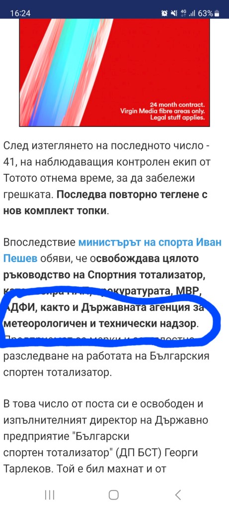 “Впоследствие министърът на спорта Иван Пешев обяви, че освобождава цялото ръководство на Спортния тотализатор, като сезира НАП, прокуратурата, МВР, АДФИ, както и Държавната агенция за метеорологичен и технически надзор. “