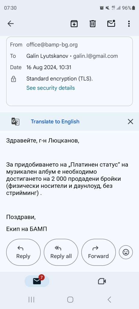 На 13-и август миналата година видях, че “Молец” имат платинен албум. Мейлнах Българската асоциация на музикалните продуценти, с въпроса: Колко албума трябва да продаде артист в България, за да получи “платинен” статус?